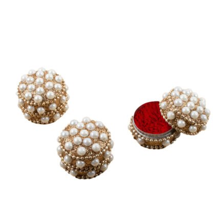 This beautiful Kumkum Box is handcrafted by the skilled artists of Jaipur, Rajasthan, India.  It includes a removable cover with a handle. These are handcrafted kumkum boxes made of aluminum and adorned with beads, stones, and other decorative accessories. This full round-shaped kumkum box is used for kumkum, sindoor, or pooja purpose. This handmade kumkum box is a perfect item to enhance the beauty of your dressing table, dining table, pooja articles, or kitchen. You can also utilize it as a decoration piece. This Handmade kumkum box is easy to clean and maintain.
